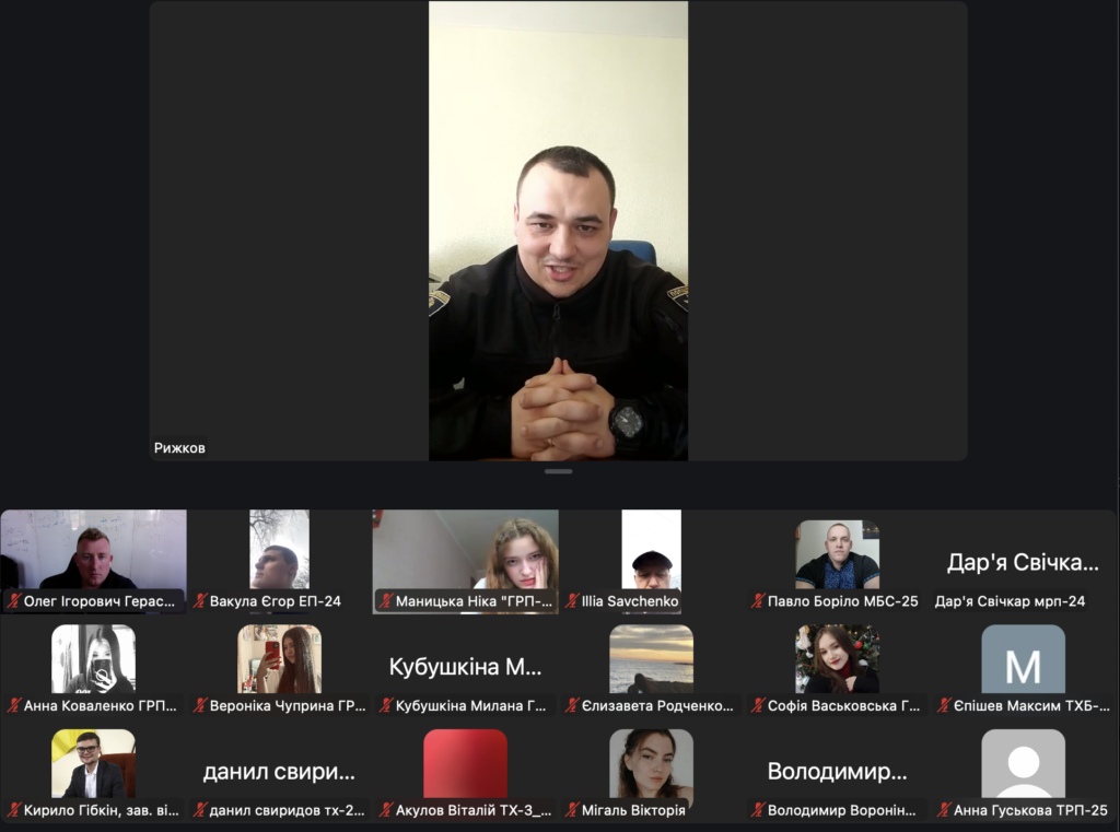 26 березня більше 150 здобувачів освіти взяли участь в онлайн-лекції на тему «Вербування та залучення дітей до диверсійної діяльності». Лекцію проводив заступник начальника сектору ювенальної превенції відділу поліції Харківського районного управління поліції № 3 капітан поліції Владислав Рижков. Під час лекції здобувачі освіти дізналися, як працюють схеми вербування підлітків через інтернет та соціальні мережі, які небезпеки можуть виникати під час спілкування з незнайомими людьми онлайн, як розпізнати спроби втягування у протиправну діяльність, що робити та куди звертатися у разі загрози.
