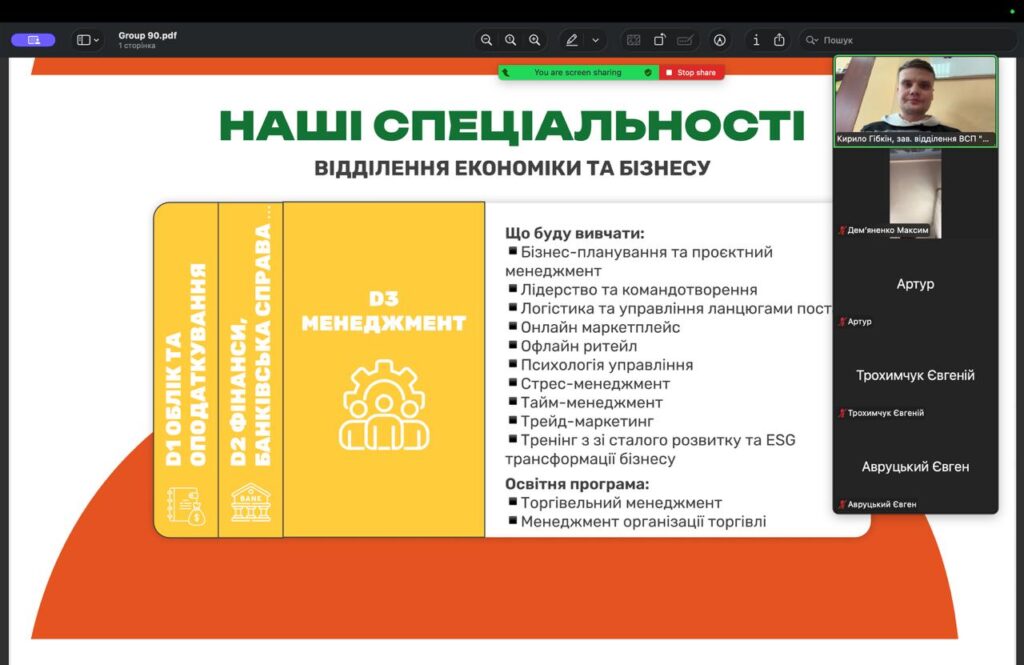 Кирило Романович представив освітнє середовище закладу, розповів про організацію освітнього процесу, можливості проходження практики, участі у міжнародних програмах і студентському житті. Завдяки інтерактивному формату учні мали змогу поставити запитання у чаті та отримати змістовні відповіді й індивідуальні консультації щодо вибору майбутньої професії.