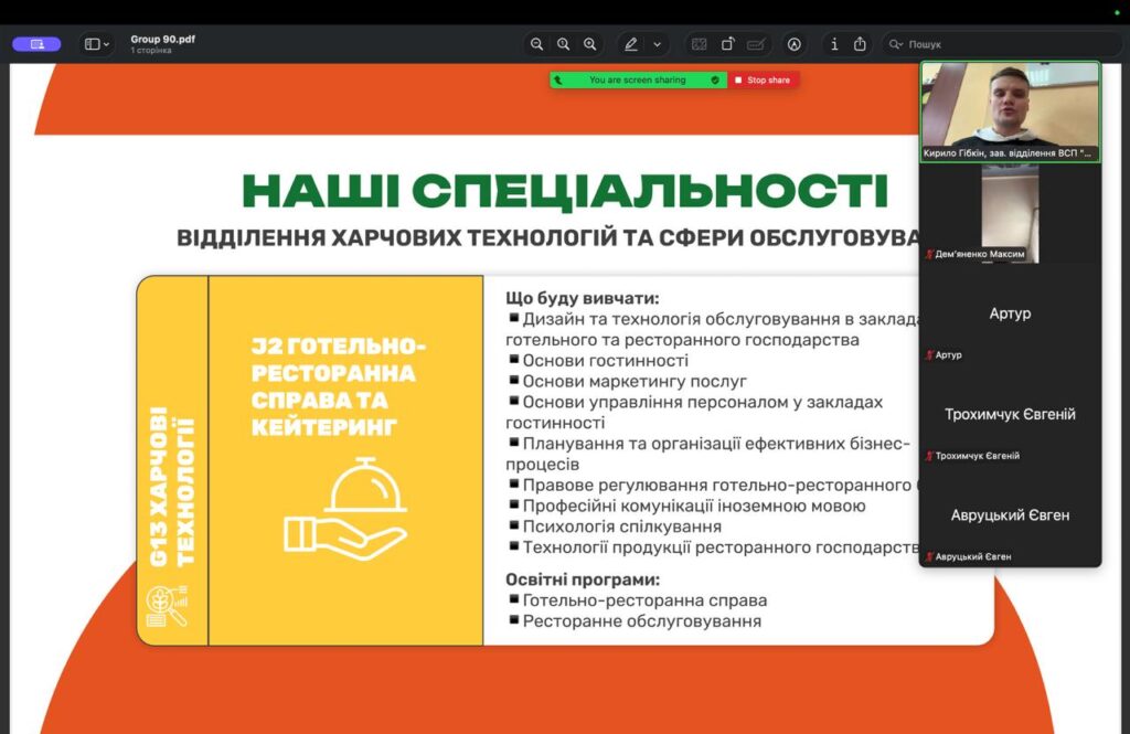Під час онлайн-зустрічі учасники ознайомилися з особливостями вступної кампанії, переліком освітніх програм і спеціальностей, за якими здійснюється підготовка фахівців у коледжі. Особливу увагу було приділено напрямам готельно-ресторанної справи, туризму, економіки та управління як перспективним і затребуваним на сучасному ринку праці.